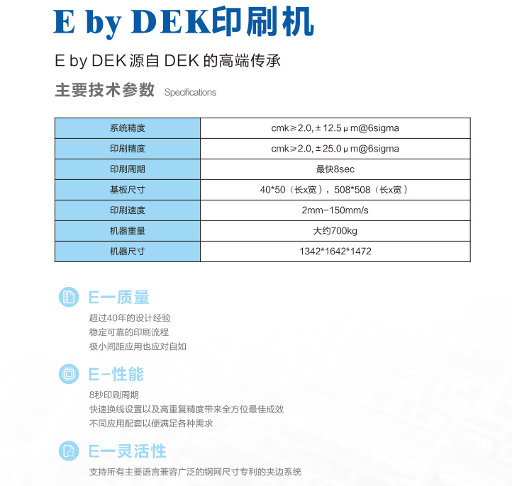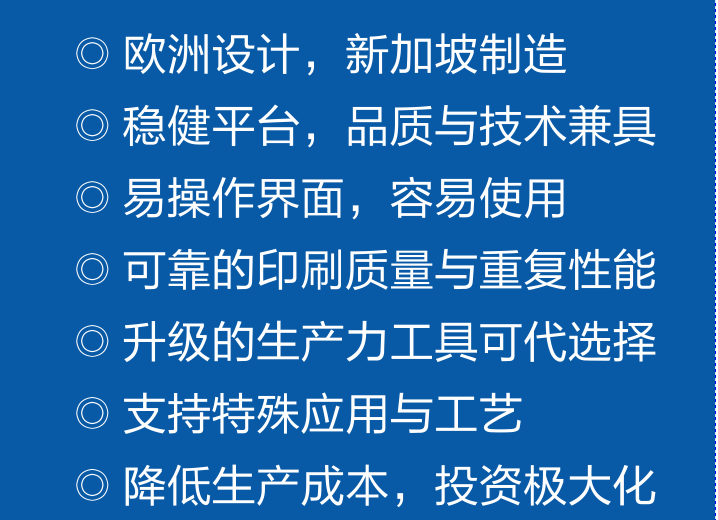 Eby DEK印刷機(jī),歐洲設(shè)計,新加坡制造。穩(wěn)健平臺,品質(zhì)與技術(shù)兼具,易操作界面和容易使用。可靠的印刷質(zhì)量與重復(fù)性能。